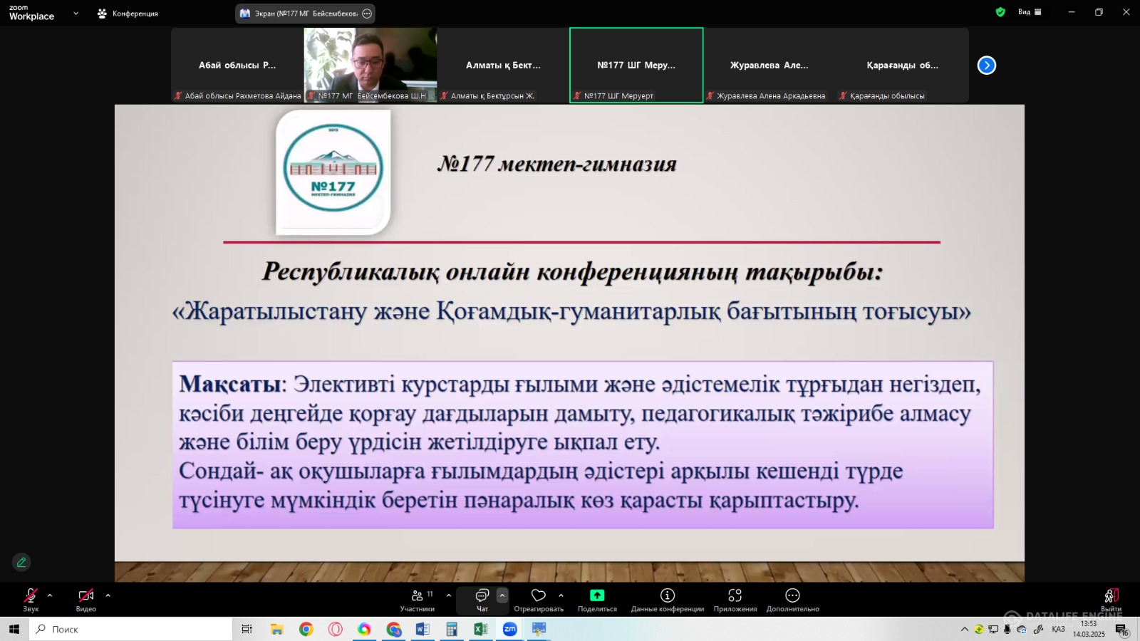 Элективті курстарын ғылыми және әдістемелік тұрғыдан негіздеп, кәсіби деңгейде қорғау дағдыларын дамыту, педагогикалық тәжірибе алмасу және білім беру үрдісін жетілдіруге ықпал ету, сондай- ақ оқушыларға ғылымдардың әдістері арқылы кешенді түрде түсінуге мүмкіндік беретін пәнаралық көз қарасты қарыптастыру мақсатында №177 мектеп-гимназияның ұйымдастыруымен онлайн конференция өтті. Конференция бағдарламасына сай білім беру ұйымының тарих пәнінің мұғалімі Танатов Тұрсын Танатович « Қазақ тарихындағы көтерілістер » , география пәнінің мұғалімі Раимбекова Керемет Апбазовна « Географиялық картамен жұмыс арқылы ғылыми-танымдық дағды қалыптастыру » , математика пәнінің мұғалімі Жабаева Айгүл Нурлыбековна « Математикалық логикалық есептер », информатика пәнінің мұғалімі Бейсембекова Шынар Нуралиевна « Компьютерлік сауаттылық негіздері » , химия пәнінің мұғалімі Абылханова Алмира Бекежановна « Қызықты химия пәні » атты тақырыптарда жеке өздерінің ұсынған авторлық бағдарламаларының заманауи білім беру талаптарына толық сәйкес келетіндігімен қатар, оқушылардың зерттеушілік, талдау және практикалық дағдыларын дамытуға, қоғамдық және жаратылыстану бағыттағы пәндер бойынша білім алушылардың теориялық білімдерін меңгеруге мүмкіндік беретінін атап өтті. Бағдарламалардың жалпы және орта білім беру ұйымдарының оқытушыларына көмекші құрал ретінде, ал жас мамандар мен оқушылардың шығармашылық ізденісіне одан әрі жол ашатын таптырмас құрал екенін жеткізді.