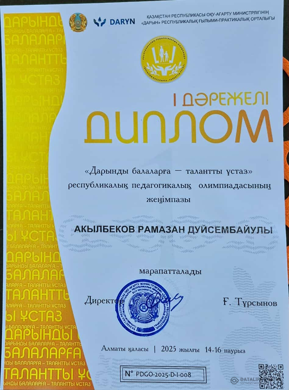 17 наурыз 2025 0 1 2 3 4 5 "Дарынды балаларға-талантты ұстаз" республикалық байқауының республикалық кезеңі " Дарынды балаға- талантты ұстаз" республикалық байқауының республикалық кезеңінде тарих пәні мұғалімі Акылбеков Рамазан 1 орын алды! Осы беттің QR-коды:QR-код этой страницы:
