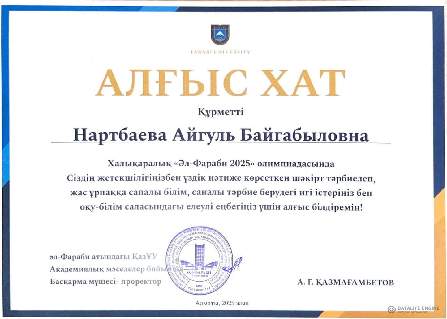 07 сәуір 2025 0 1 2 3 4 5 Халықаралық "Әл-Фараби 2025" олимпиадасы Халықаралық " Әл- Фараби 2025" олимпиадасының ІІІ орын жүлдегері 11 " Г " сынып оқушысы Жартыбай Қарақат, жетекшісі: биология пәні мұғалімі Нартбаева Айгуль Осы беттің QR-коды:QR-код этой страницы:
