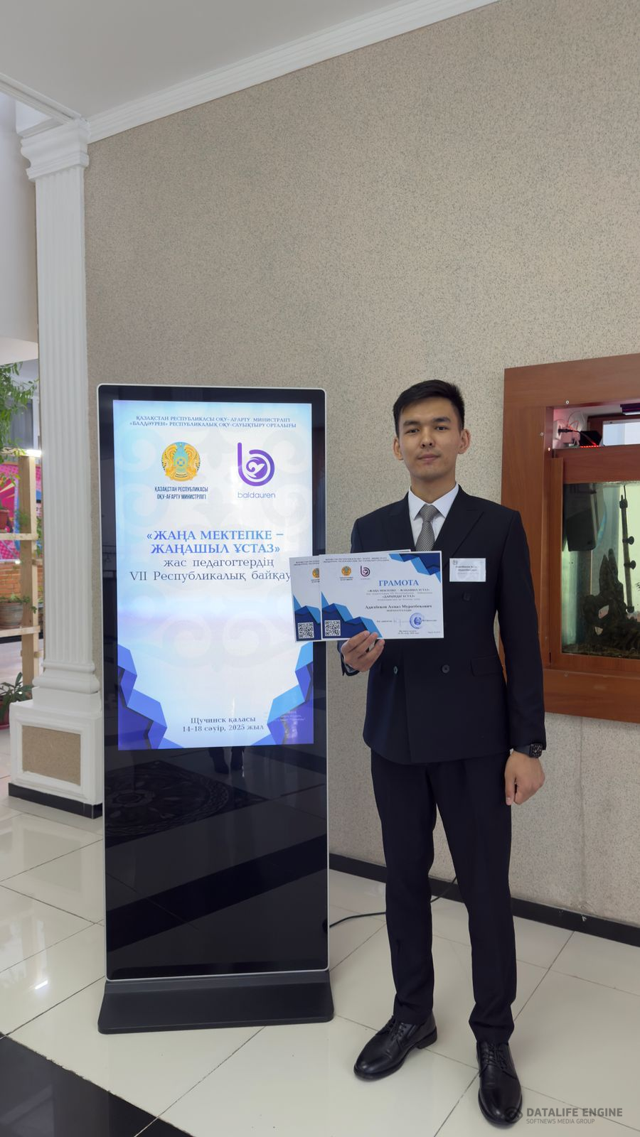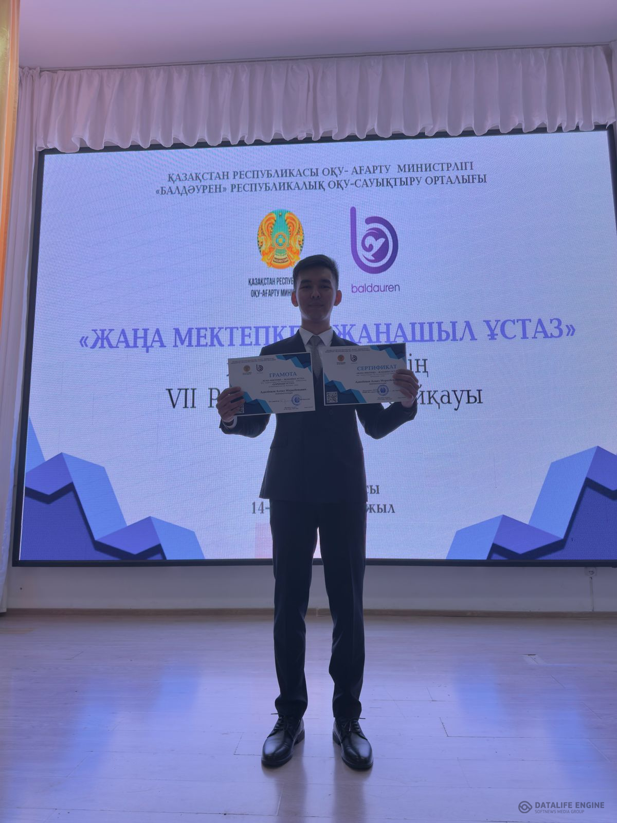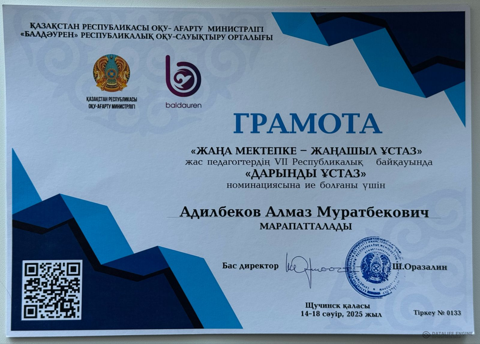 « Жаңа мектепке-жаңашыл ұстаз » жас педагогтердің VII республикалық байқауында 14.04-18.04.2025ж. күні аралығында Көкшетау қаласында өткен байқауға қатысып, математика пәні мұғалімі Адилбеков Алмаз Муратбекович «Дарынды ұстаз» номинациясы бойынша грамотаға ие болды.