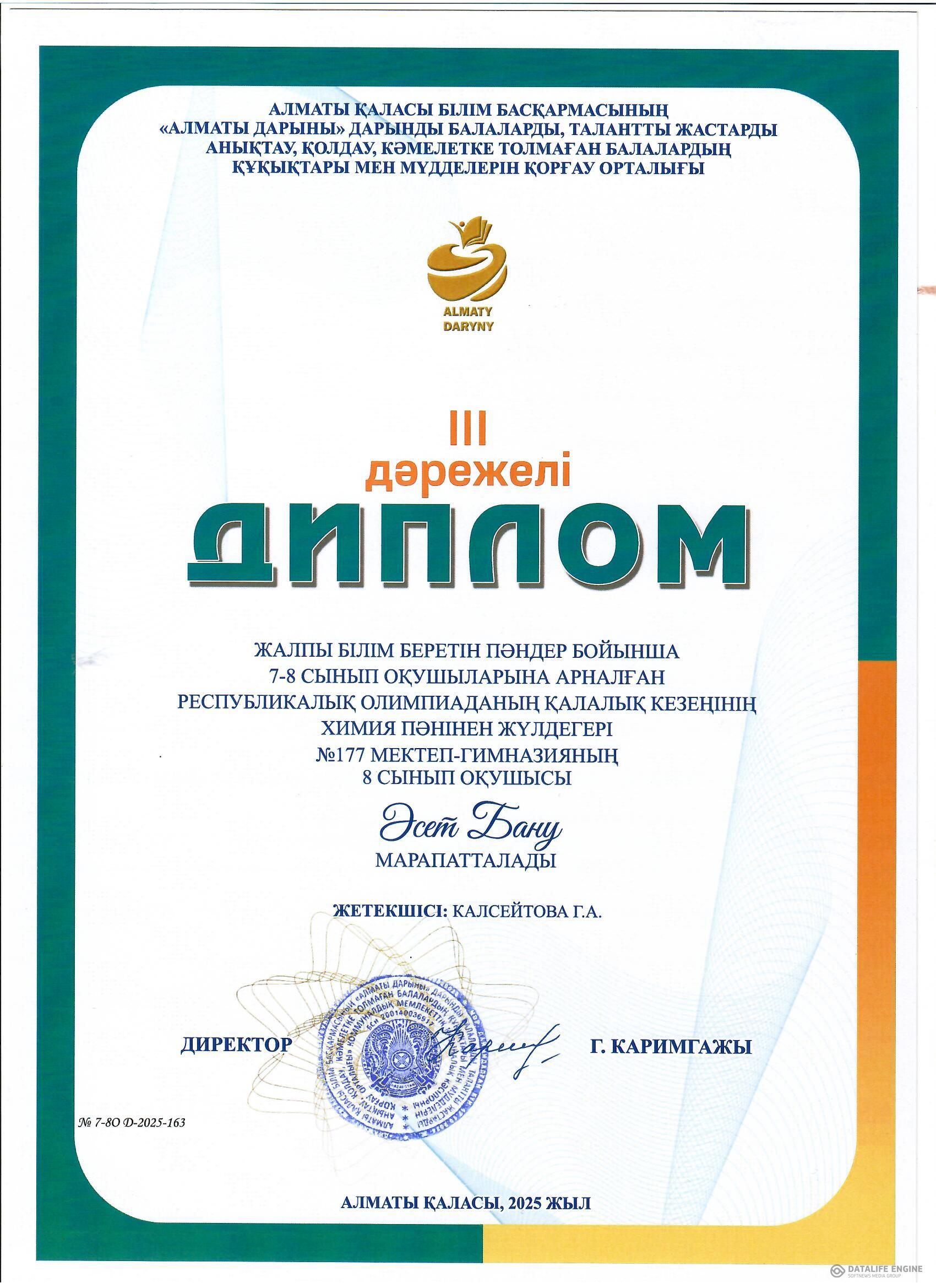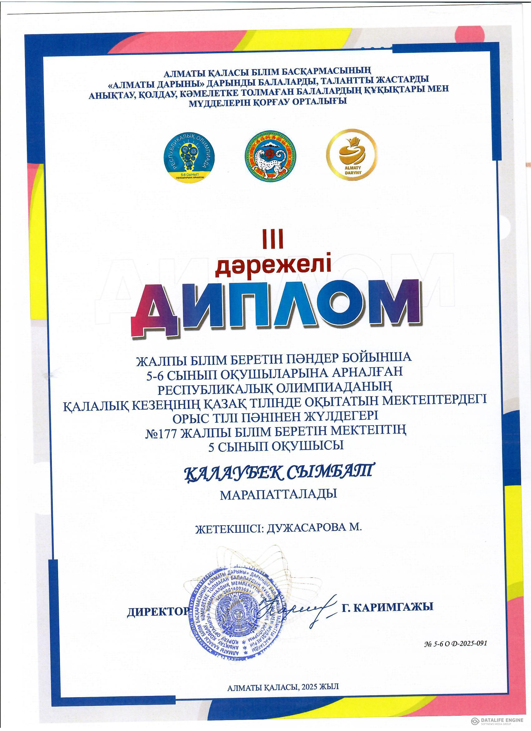 Қалаубек Сымбат - ІІІ орын, 5-сынып , орыс тілі мен әдебиеті пәні, жетекшісі Дужасарова Майра