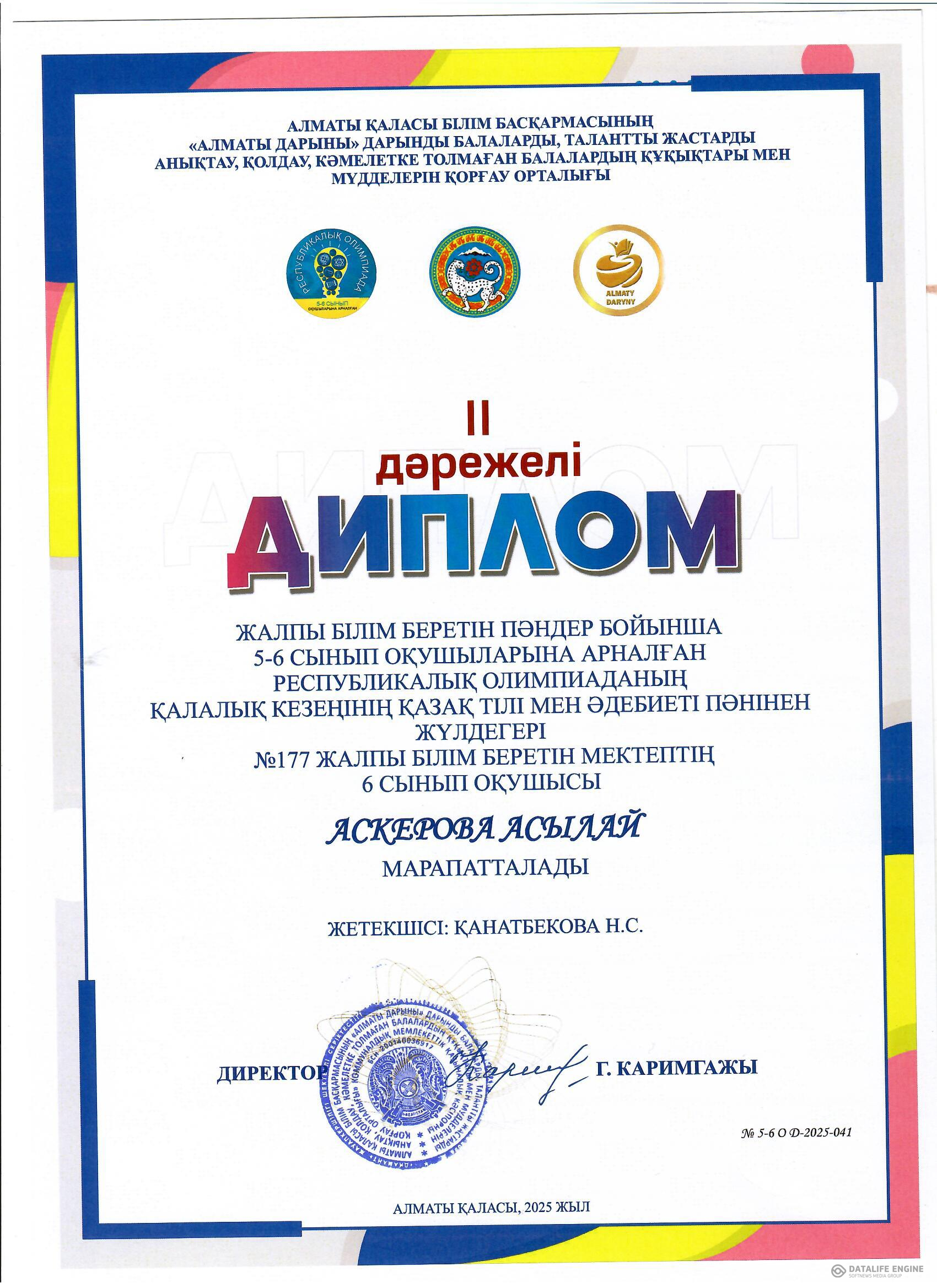 Аскерова Асылай- ІІ орын , 6- сынып, қазақ тілі мен әдебиеті пәні, жетекшісі Қанатбекова Назерке