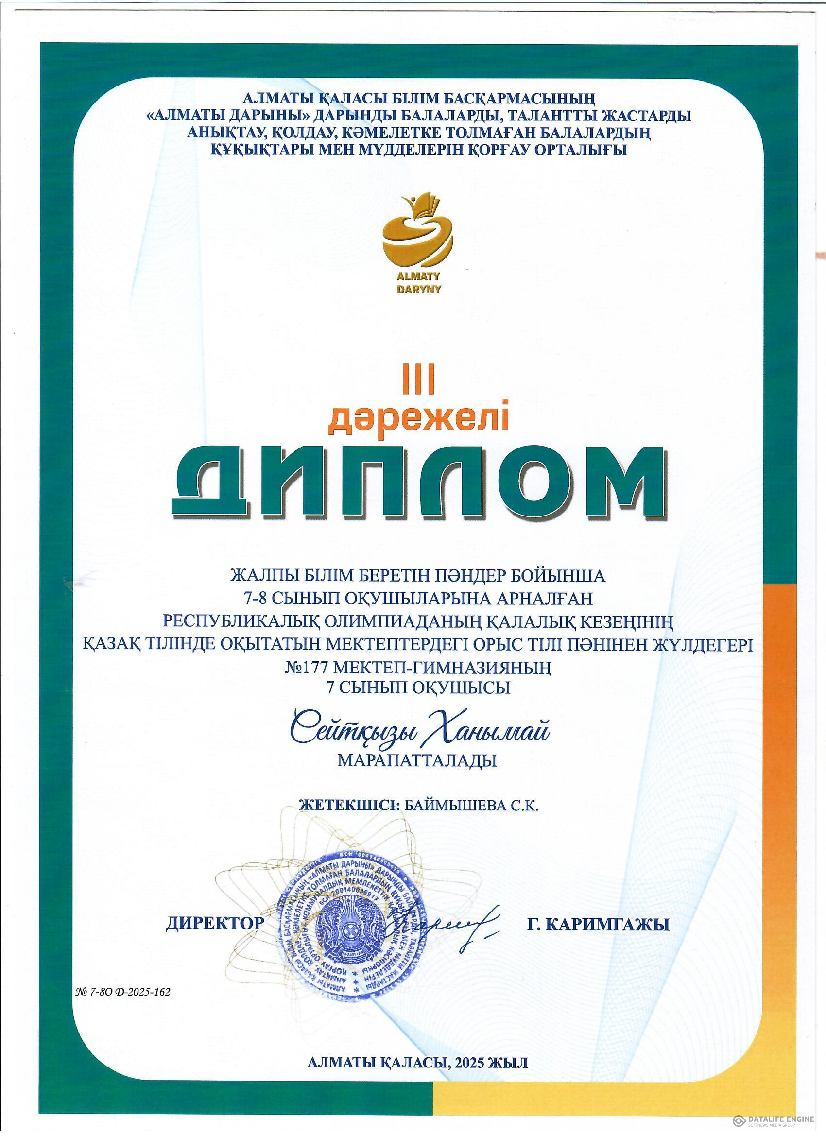 7- сынып Сейтқызы Ханымай - ІІІ орын, жетекшісі : Баймышева Самал