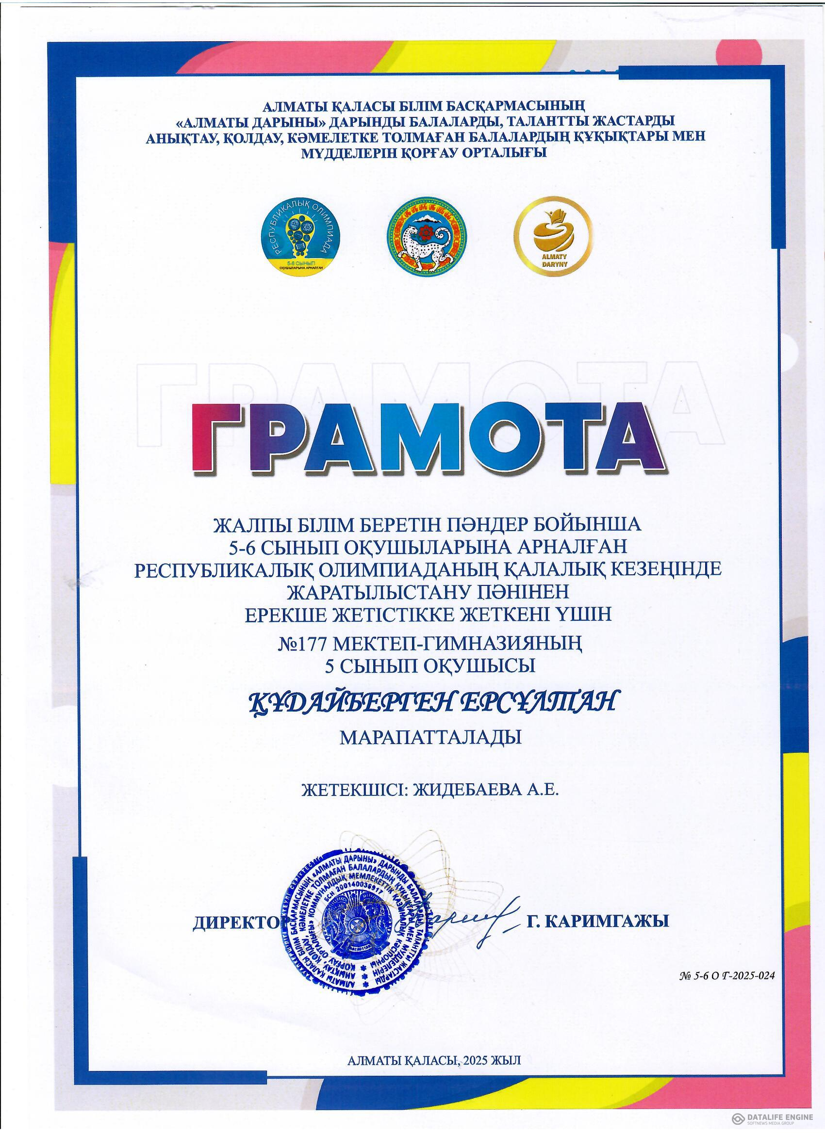 Құдайберген Ерсұлтан - грамота , 5-сынып, жаратылыстану пәні , жетекшісі Жидебаева Ақсұлу
