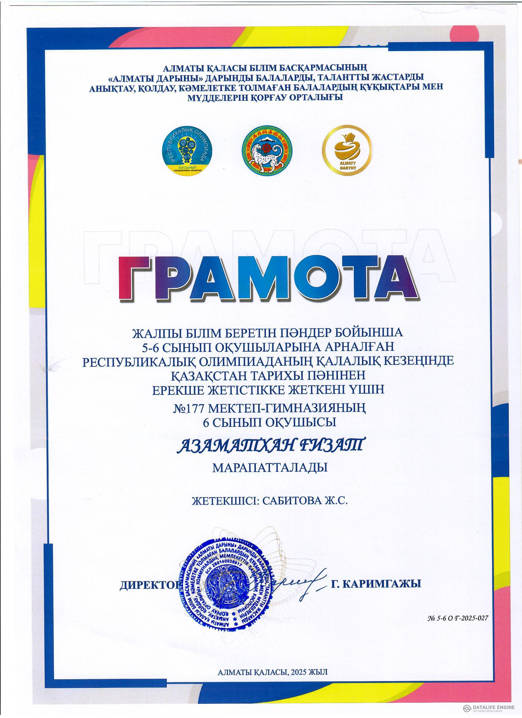 Азаматхан Ғизат- грамота , 6- сынып, Қазақстан тарихы, жетекшісі Сабитова Жазира