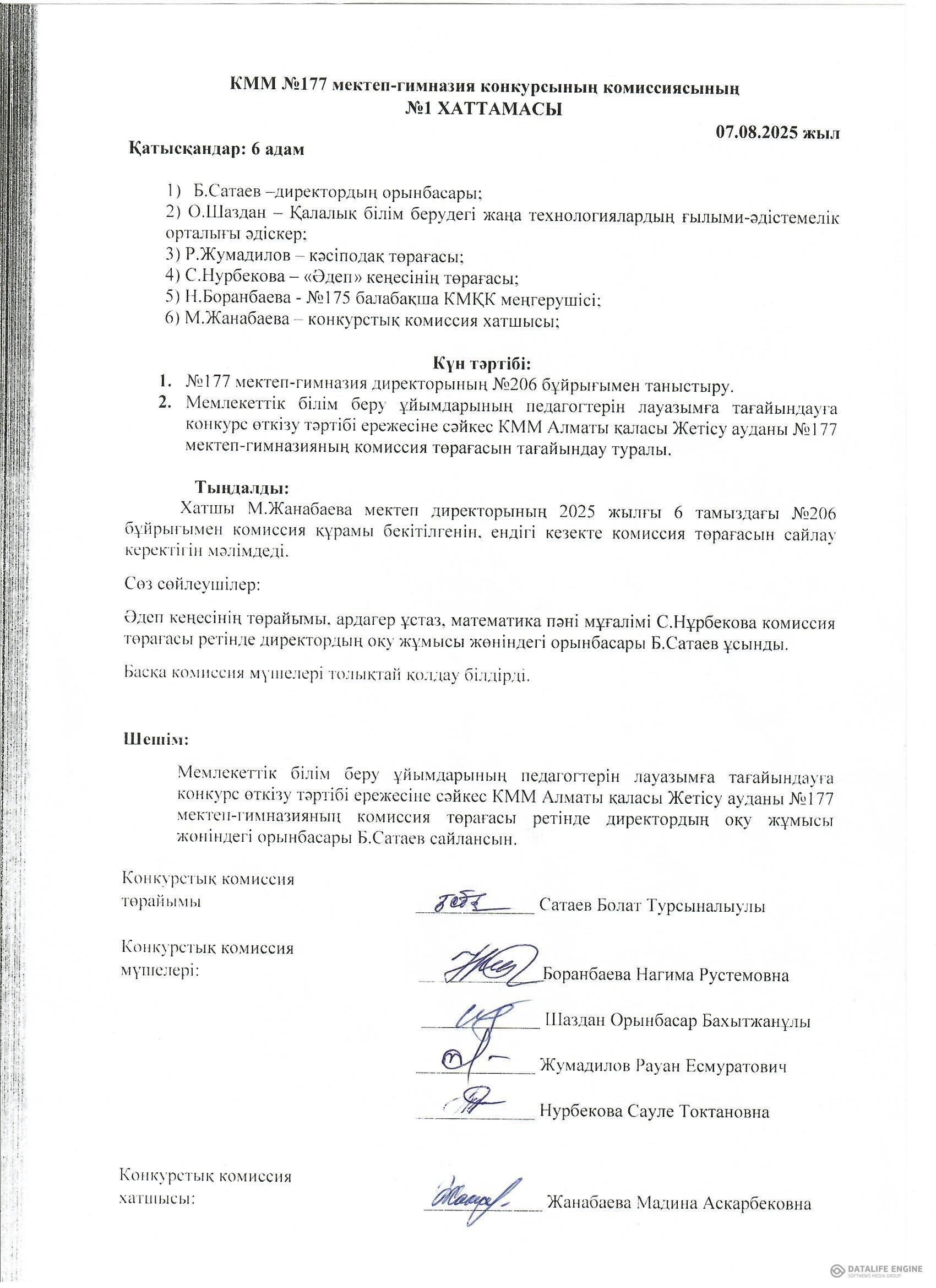 Педагог қызметкерлерін лауазымға тағайындау конкурсының Хаттамасы №2