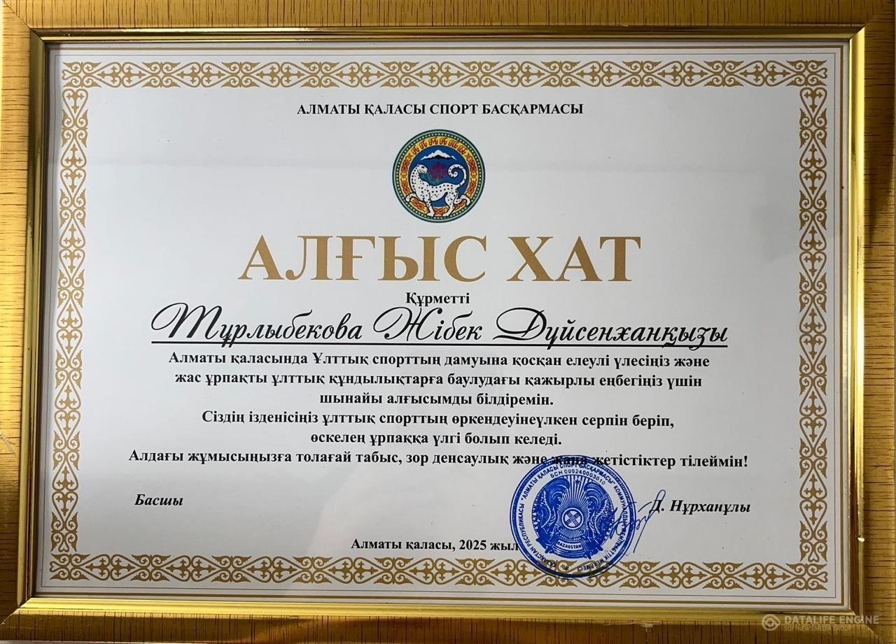 Аман Айша, Тулемисова Аруназға Алматы қаласы Спорт басқармасының ном 39-шы бұйрығына сәйкес *“ Қазақстан Республикасының спорт шеберіне үміткері” ( КМС) спорттық атағы берілді. Сонымен қатар аталған оқушылар ҚР-ның ” Ұлттық ҚҰРАМА” командасына кірді. Жаттықтырушы: Тұрлыбекова Жібек Дүйсеханқызы.