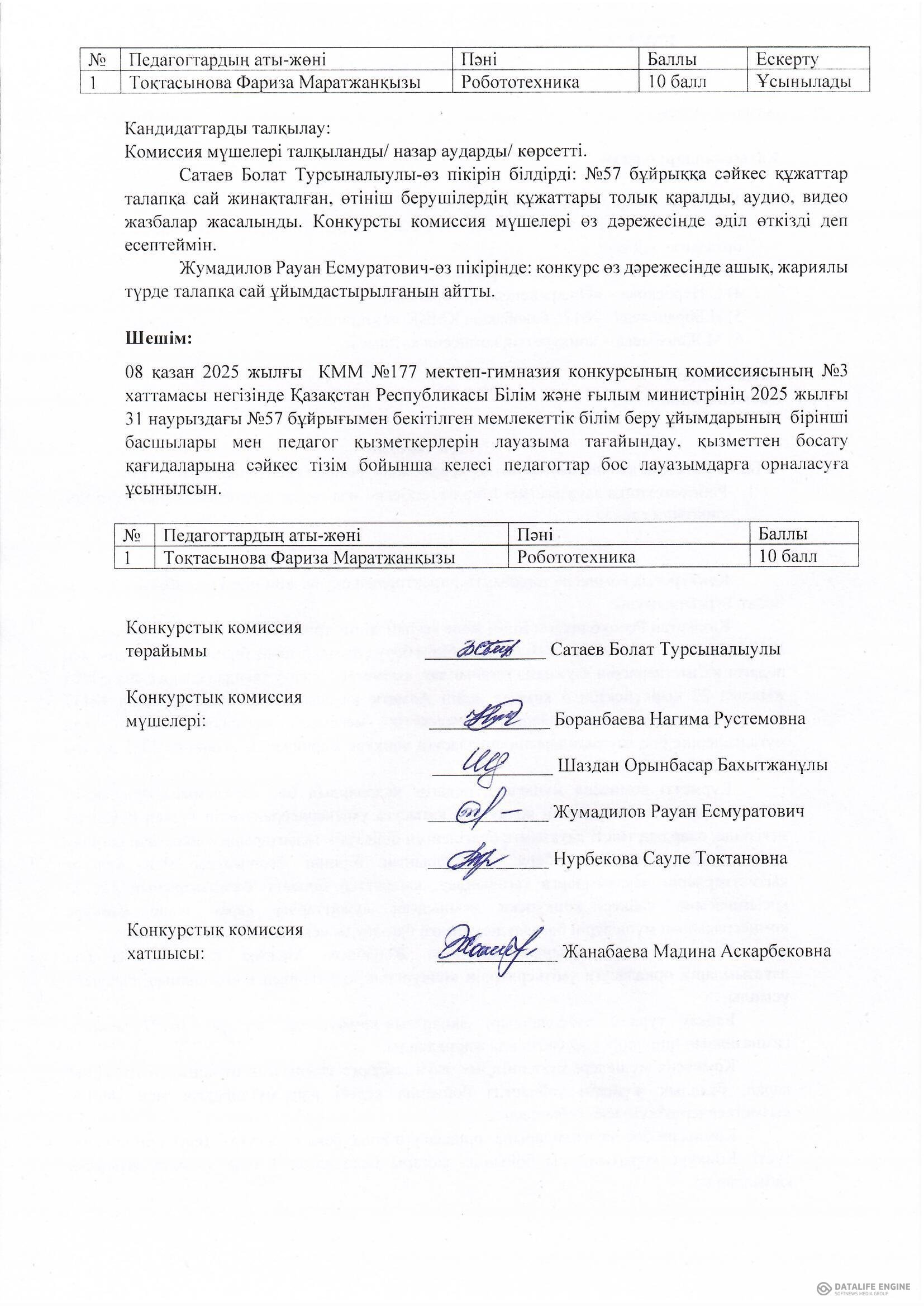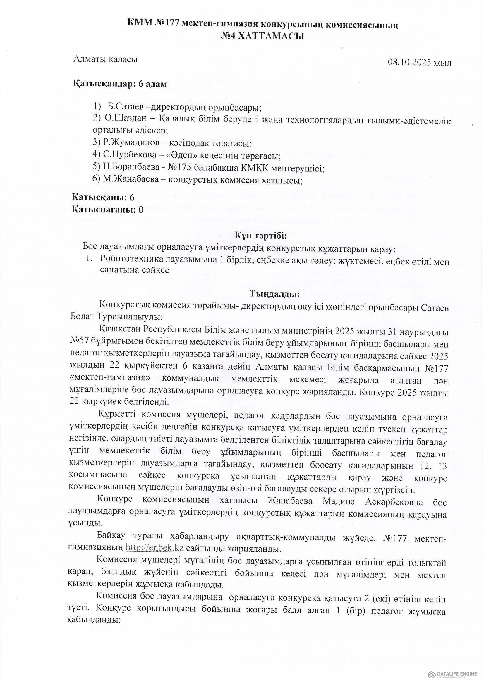 Хаттама №1 Педагогтерді лауазымға тағайындау конкурсының бекітілген комиссия құрамы