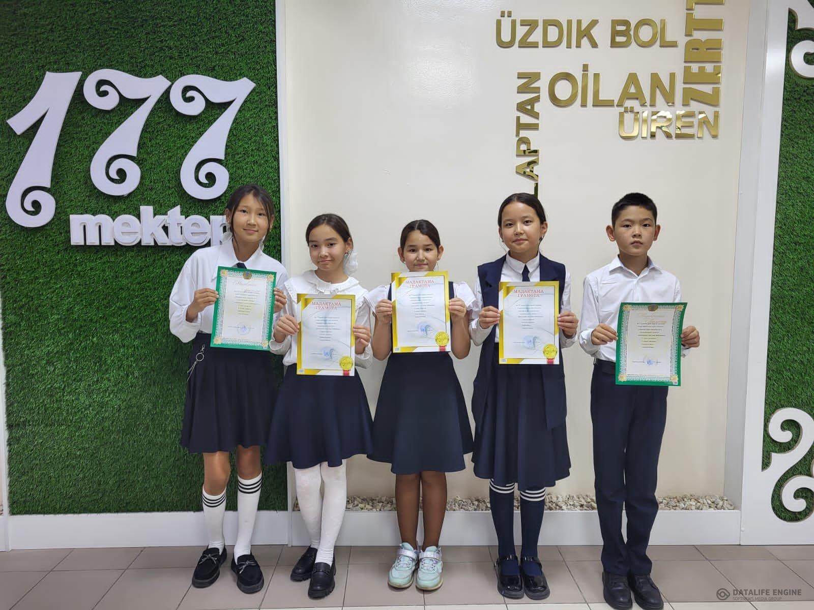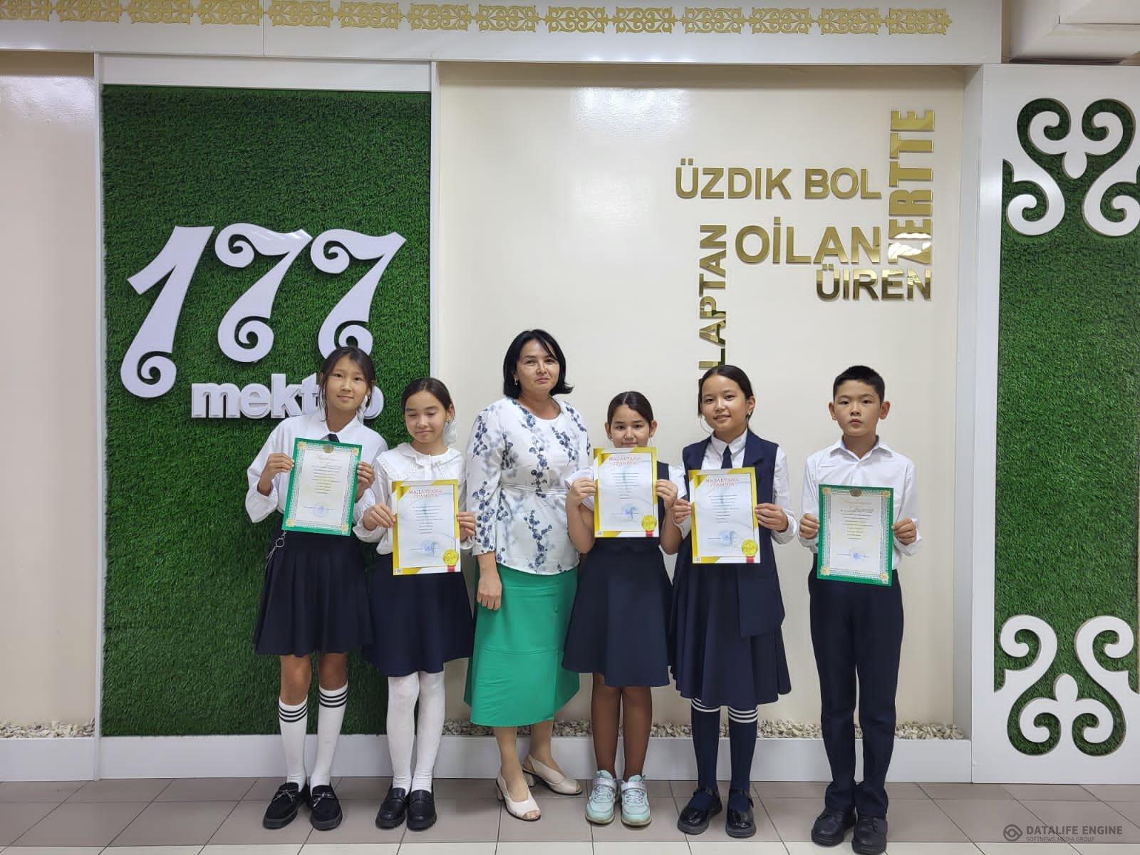 Байқау нәтижесінде1)Қырықбаева А.11-сынып, 1-орын, 2) Маратқызы А. 11-сынып, 2-орын, 3) Нажмидинов Б. 11-сынып 3-орын; 4) Кемал А.10-сынып 1-орын, 5) Рүстем Н. 10-сынып, 2-орын, 6) Мыңбаева С. 10-сынып 3-орын; 7) Мұрат Әсем 9-сынып, 1-орын, 8) Есенгельдинова А. 9-сынып, 2-орын, 9) Ким Томирис 9-сынып 3-орын;10)Қасен Р.8-сынып, 1-орын, 11) Қадылқызы Ж. 8-сынып, 2-орын, 12) Қадырхан А. 8-сынып, 3-орын; 13)Тәжіғали А. 7-сынып, 3-орын,14) Худайберген Н. 7-сынып, 3-орын; 15)Таңат А. 6-сынып, 2-орын,16) Дәкен А. 6-сынып, 2-орын,17) Сағындық А. 6-сынып, 3-орын, 18) Мұратова А. 6-сынып, 3-орын;19) МустафиноваА. 5-сынып, 1-орын, 20) Серікқали Ж. 5-сынып, 2-орын,21)Төреқұл Е. 5-сынып, 3-орын жеңімпаздары мектеп директорының мақтау қағазымен марапатталды.