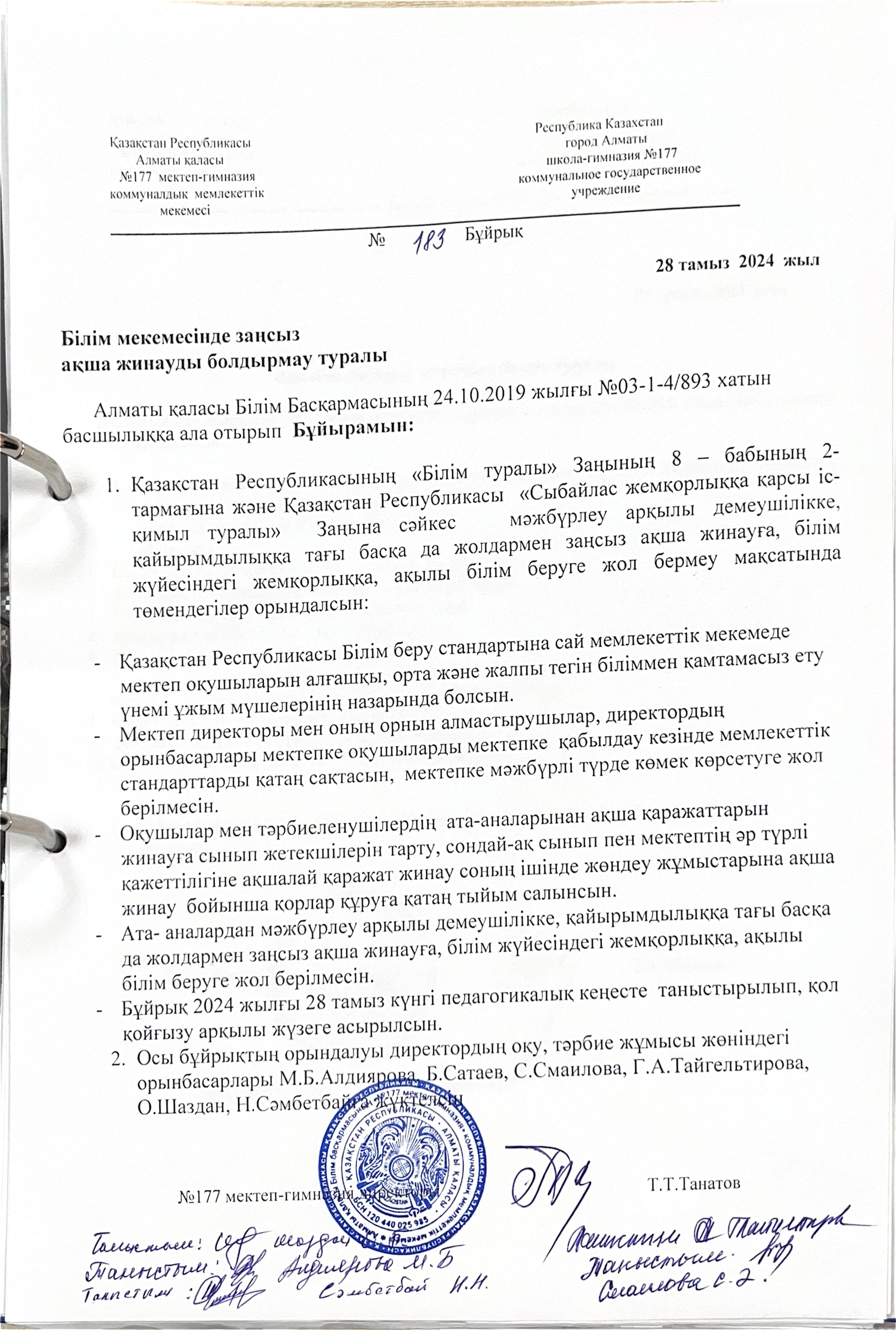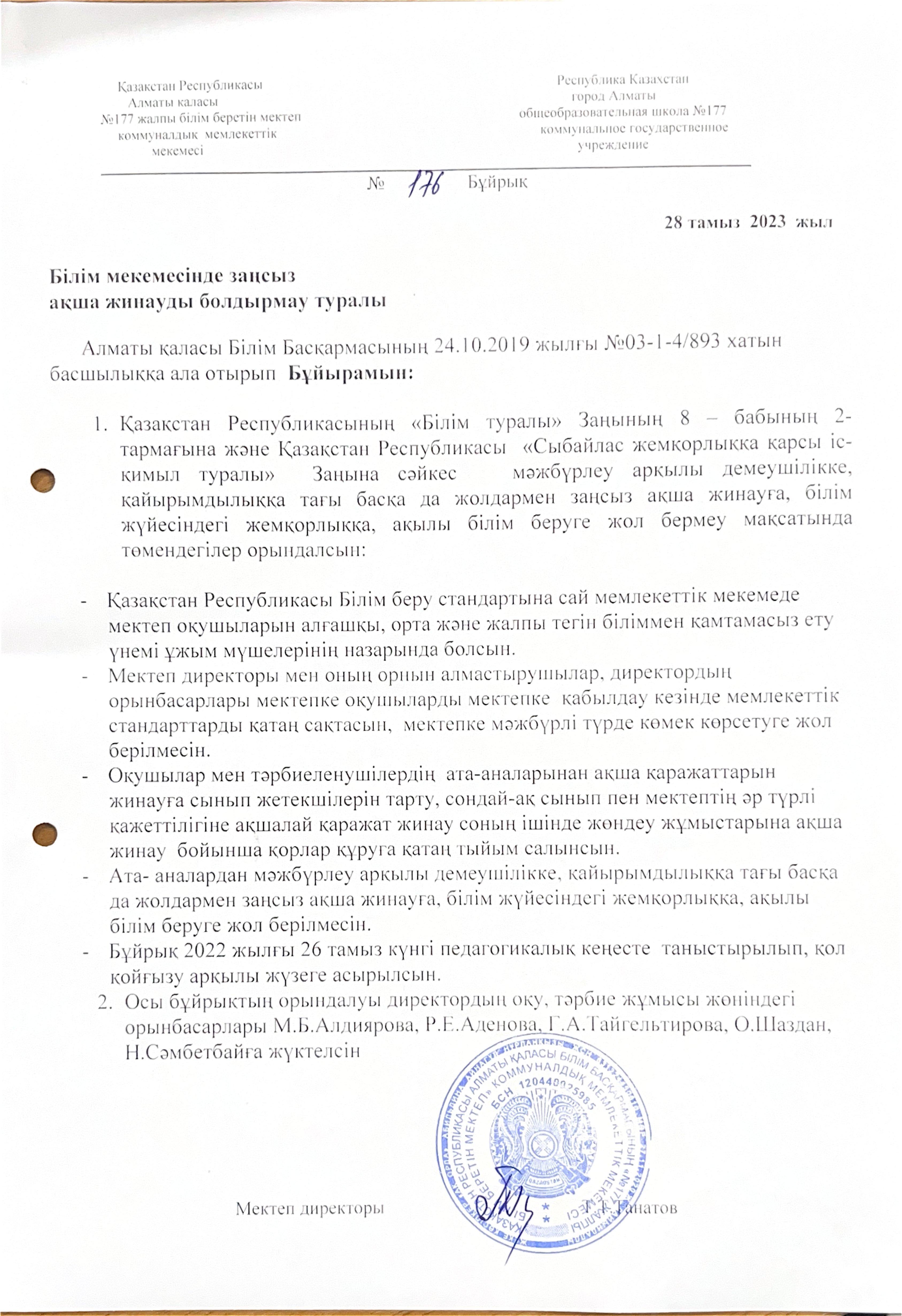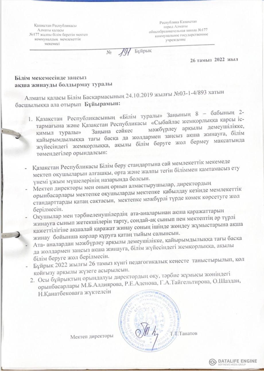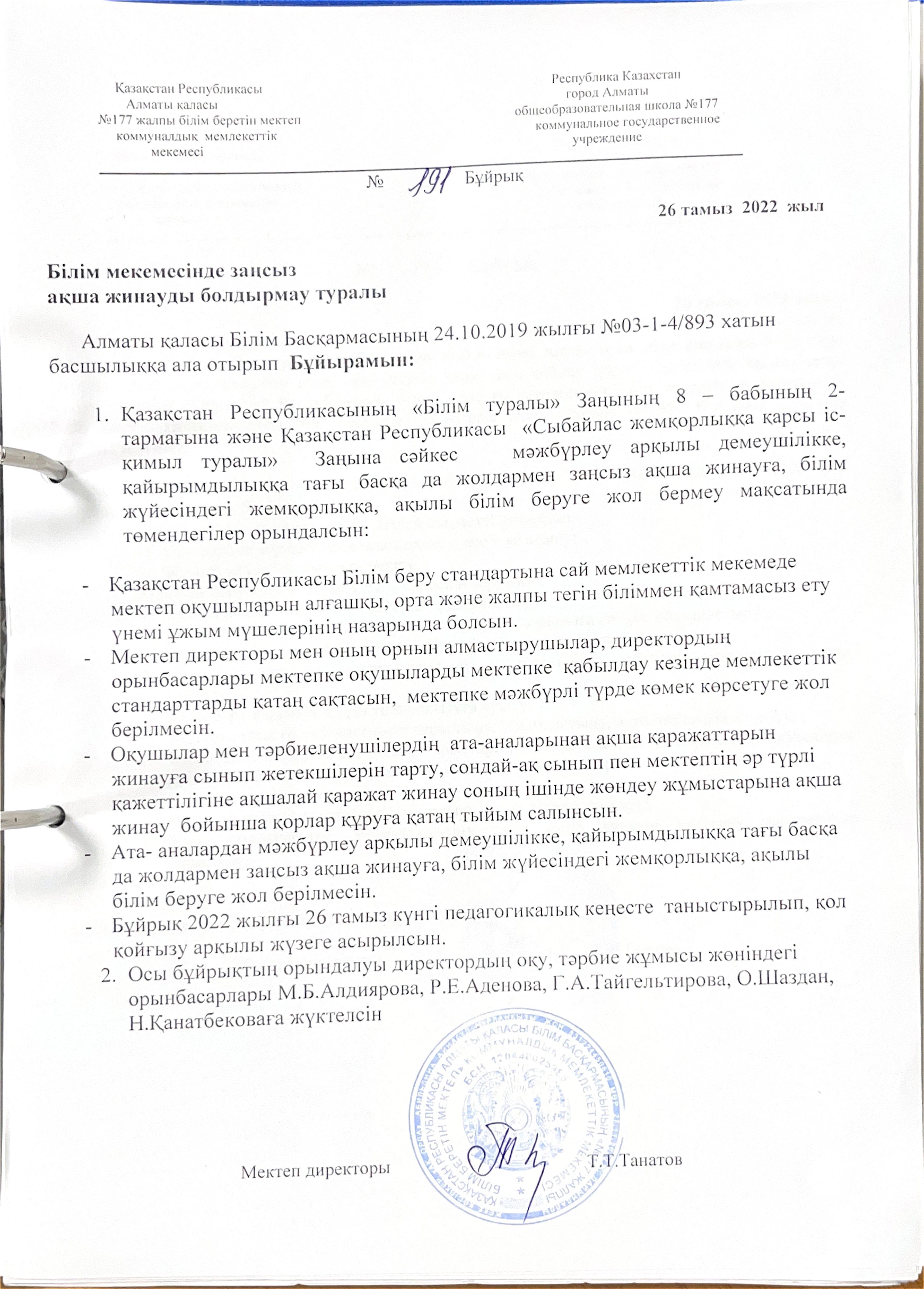 Жемқорлыққа жол бермеу бұйрығы