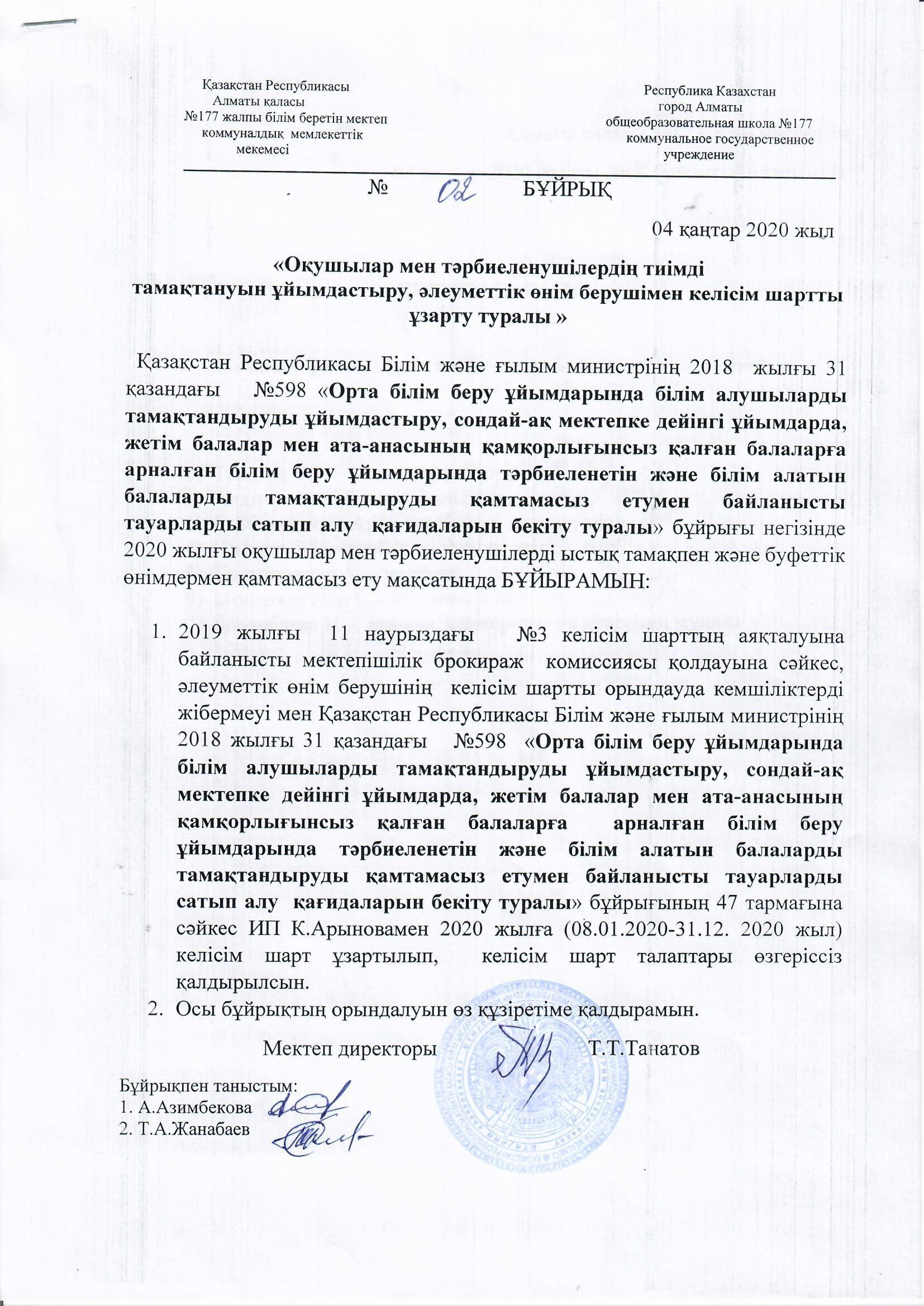 05 қаңтар 2020 0 1 2 3 4 5 Бұйрық №2 Оқушылар мен тәрбиеленушілердің тиімді тамақтануын ұйымдастыру, әлеуметтік өнім берушімен келісім шартты ұзарту туралы Осы беттің QR-коды:QR-код этой страницы:
