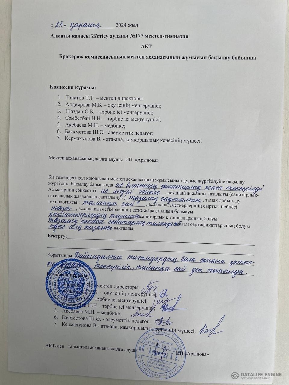 АКТ Брокираж комиссиясынын мектеп асханасынын жумысын бакылау бойынша