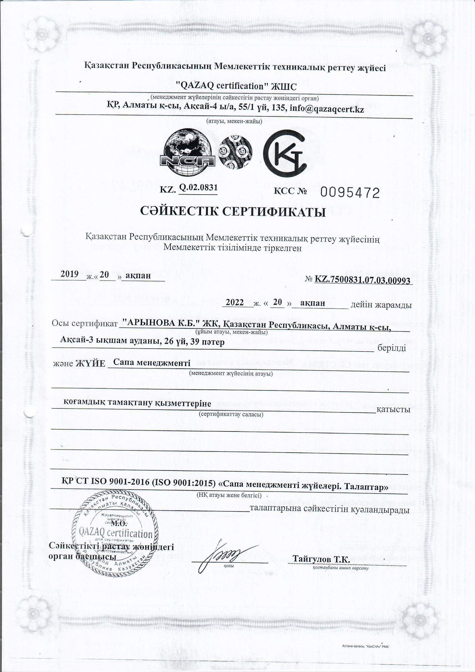 05 қаңтар 2020 0 1 2 3 4 5 Сәйкестік сертификат. Сапа менеджменті жүйелері. Талаптар Осы беттің QR-коды:QR-код этой страницы: